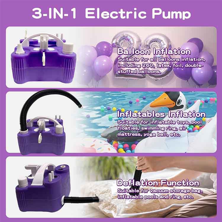 3 v 1 Elektrické balónové čerpadlo používať technológiu na zjednodušenie života a na vytvorenie kreativity v dosahu. Či už ide o rodinné stretnutie, oslavu sviatkov, vonkajšie dobrodružstvo alebo domáce skladovanie, je to nevyhnutný artefakt, ktorý zlepšuje kvalitu vášho života! Získajte teraz a začnite nový zážitok z efektívnej a pohodlnej inflácie!