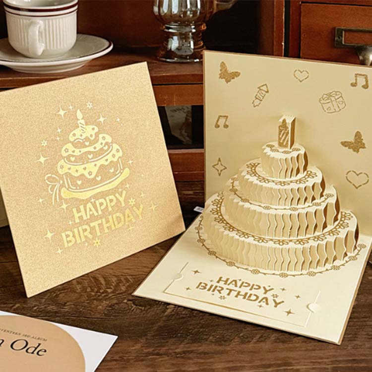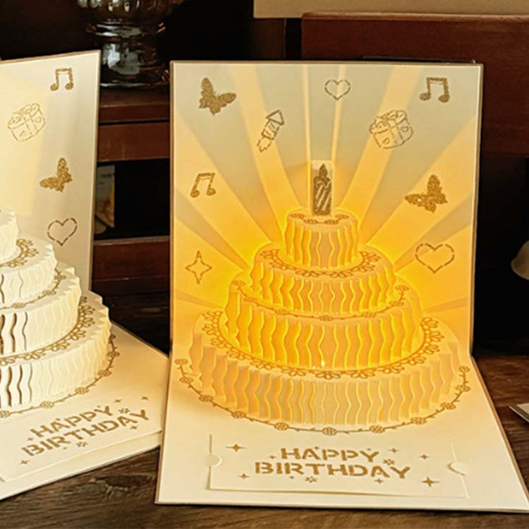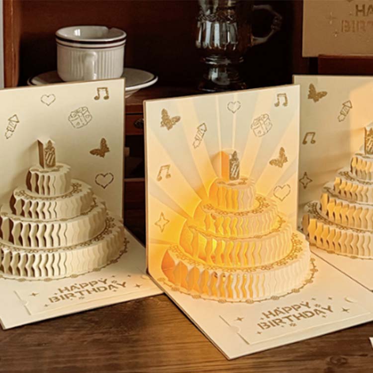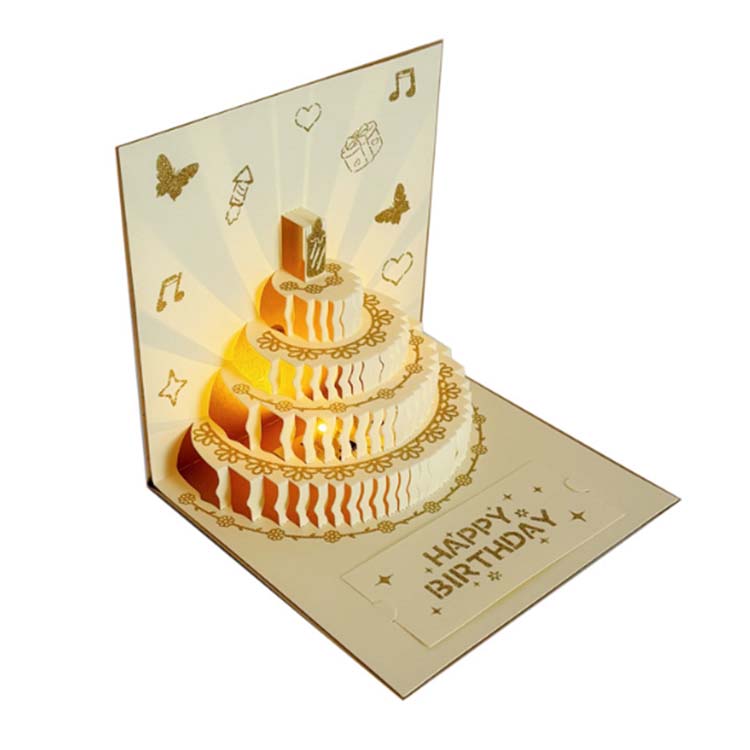 Obálka 3D narodeninovej karty je vyrobená z farebného reliéfneho procesu. Jeho interiér má dizajn štvorvrstvového koláča a pre blahoželanie sa pridá malá pohľadnica.