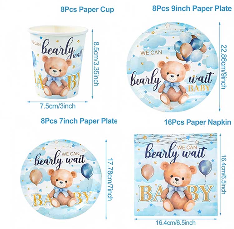 Veľkosť súpravy jednorazových tanierov k narodeninám dieťaťa: Produkt je zabalený v vreciach OPP, ale k dispozícii je aj balenie papierových kariet. Balenie vieme prispôsobiť podľa špecifických požiadaviek zákazníka.