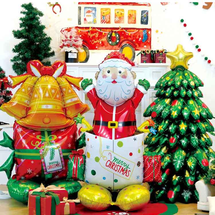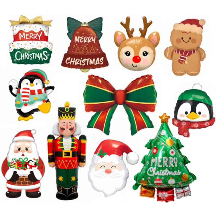 Vianočné hliníkové fóliové balóny obsahujú vo svojich dizajnoch vianočné prvky. Tieto balóny sú dostupné v klasických tvaroch ako Santa Claus, vianočné stromčeky, snehové vločky a zvončeky a sú zdobené sloganmi „Merry Christmas“. Farby obsahujú vianočné prvky, predovšetkým farby s vianočnou tematikou, ako je červená, zelená, zlatá a strieborná, čím vytvárajú slávnostnú atmosféru. Dostupné v širokej škále veľkostí, od mini 30 cm až po obrovské 100 cm, vyhovujú rôznym dekoratívnym scenárom a potrebám.