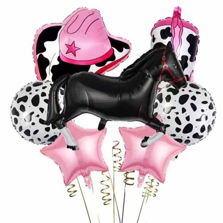 S presnými kontúrami línií a farebným zladením obnovujú svalové kontúry a splývavú hrivu bežiacich koní a bežné prirodzené farebné schémy ako hnedá a čierna lepšie zodpovedajú skutočnému obrazu koní. Niektoré fóliové balóny s kovbojskou tematikou dokonca pridávajú kovové farby, ako je strieborná a zlatá, aby sa zvýšil vizuálny dojem; vzor kravy je kruhový s vytlačenými čiernobielymi vzormi kravy a niektoré štýly pridávajú nejaké trojrozmerné dekorácie, ako sú malé zvončeky a plush chvostíky pod balónikmi z hliníkovej fólie, ktoré sú roztomilé a majú vidiecky štýl a sú veľmi obľúbenou témou pre kovbojské aktivity pre rodiny.