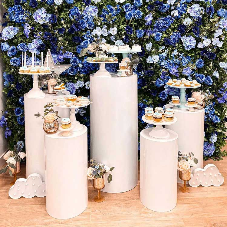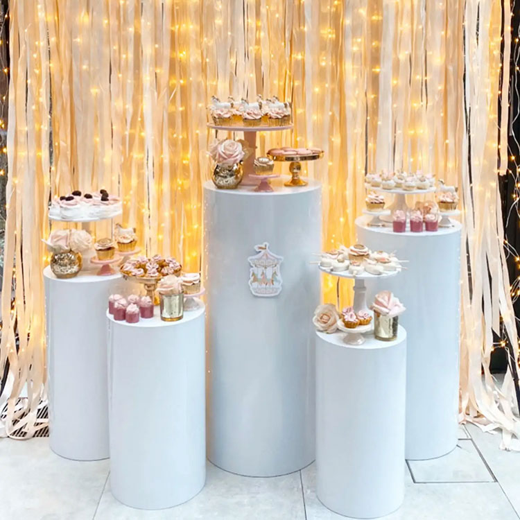 Dezertný stolík s valcovou základňou slúži ako nádoba aj ako ozdoba. Zvyčajne sa dodávajú v rôznych kombináciách: 3-dielne kombinácie, 5-dielne kombinácie, 7-dielne kombinácie atď. Najčastejšou kombináciou je päť kusov. Nezávislé valcové rúrky rôznych veľkostí sa dajú flexibilne usporiadať a sú dôležitou súčasťou scény. Zároveň ponúkame aj prispôsobenie veľkosti a tvaru. Navyše sa hodia k vašej párty dekorácii.