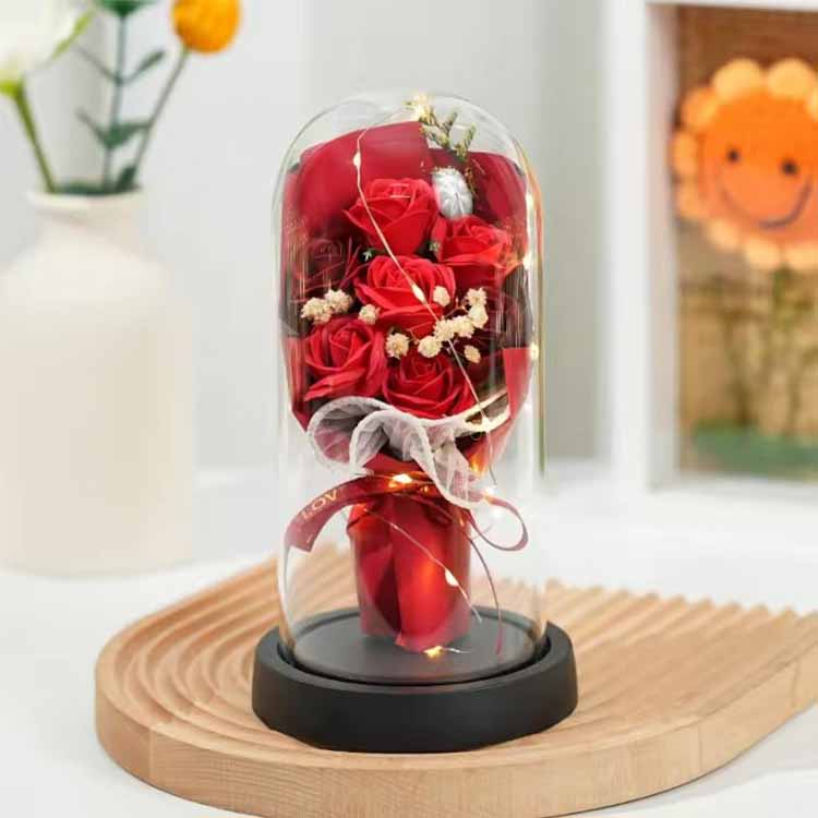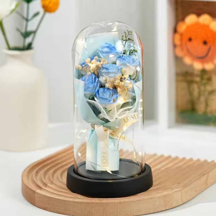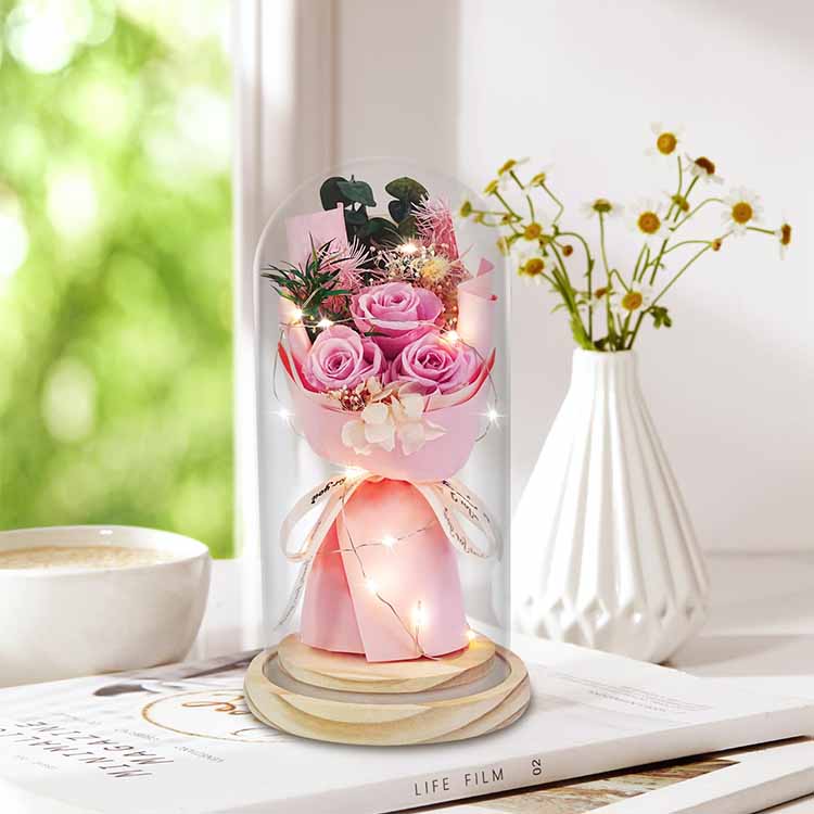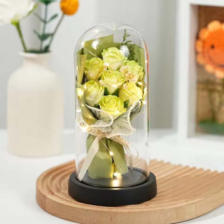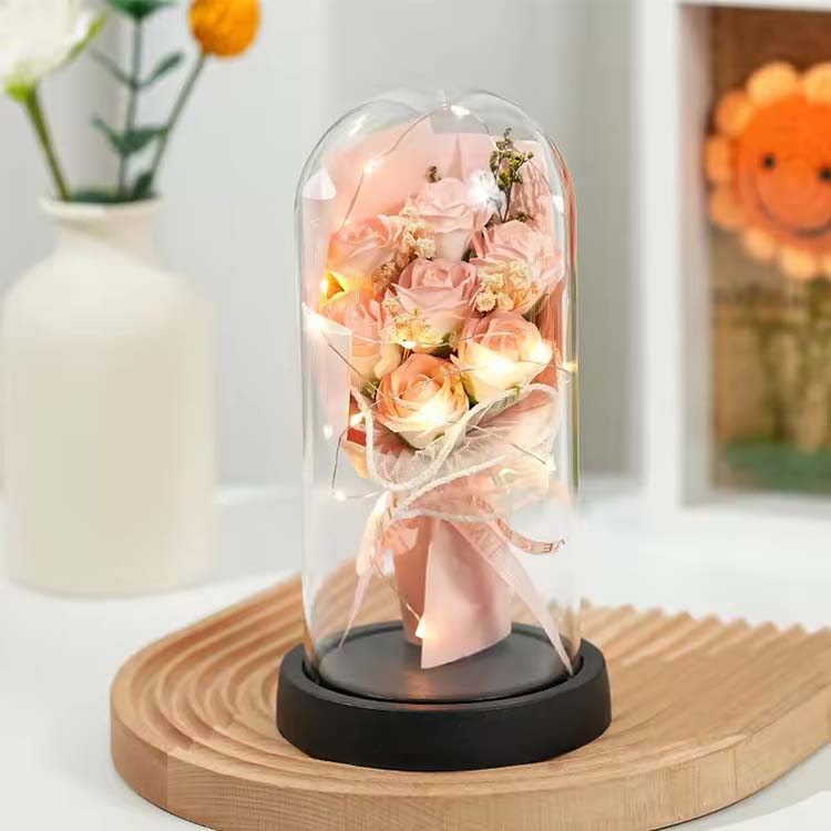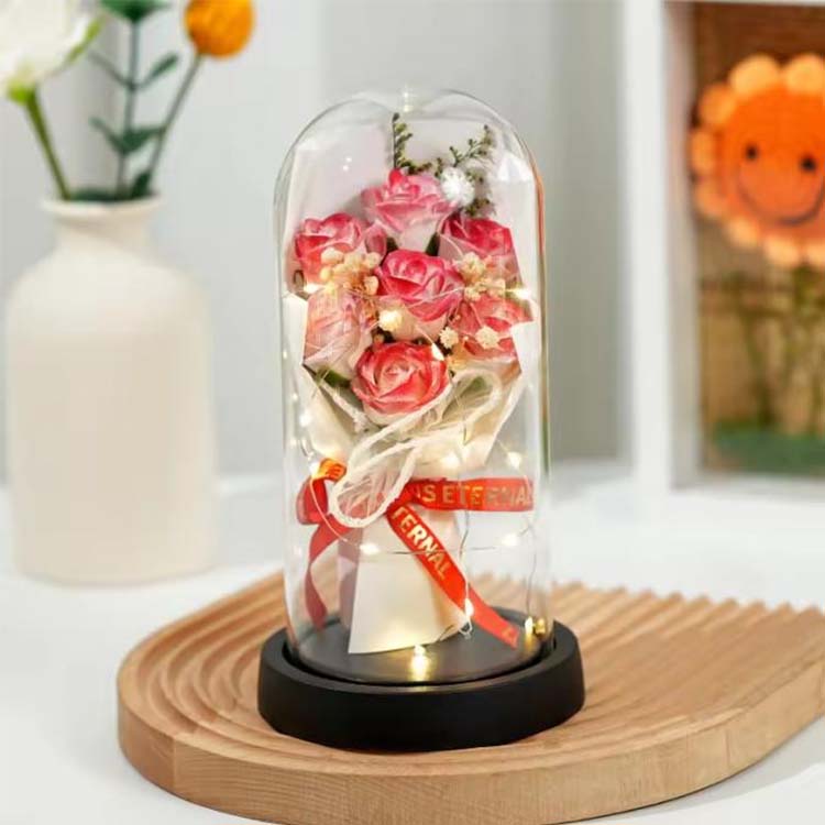 Kytica mydlových ruží zo sklenenej kupole s LED sa používa v kombinácii s mydlovými kvetmi a konzervovanými kvetmi. LED svetlá využívajú teplé a neoslňujúce svetlo, ktoré môže dodať teplú atmosféru pri zdobení scén. Vstavaný LED svetelný reťazec má tiež farebné blikajúce svetlá a farby je možné prispôsobiť vašim potrebám. Túto kyticu so skleneným krytom je možné použiť na nastavenie scén, ako sú narodeniny, výročia, návrhy, návrhy atď. darček.Večné kvety nezvädnú a nezmenia farbu ani pri sklenenom obale. Mydlové kvety sa dajú použiť aj na umývanie rúk alebo ako vôňa. Táto kytica ruží je ekonomická a praktická.