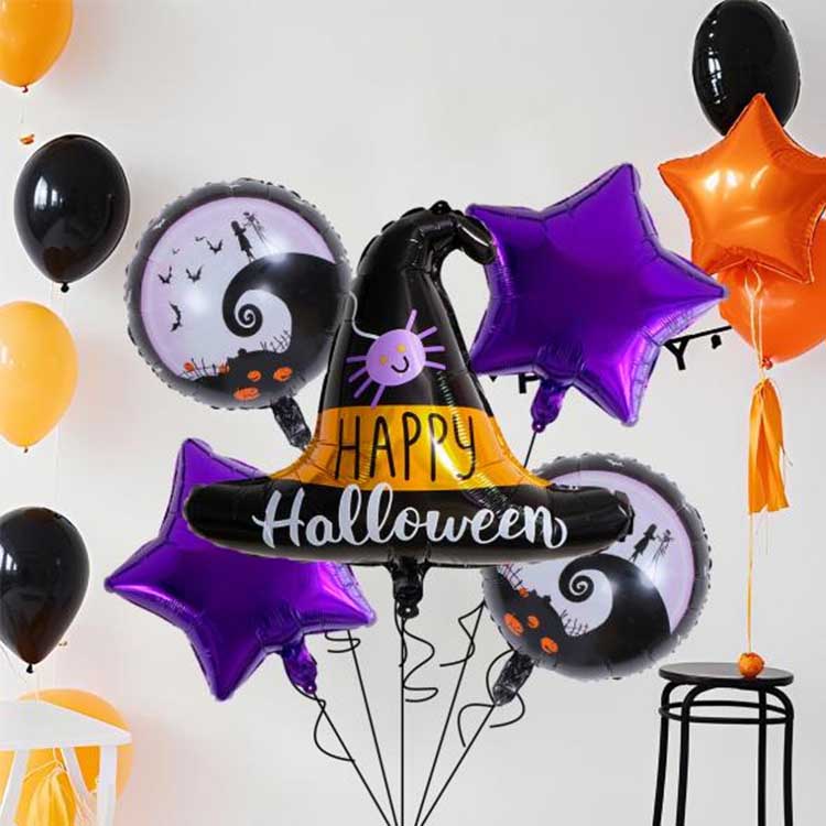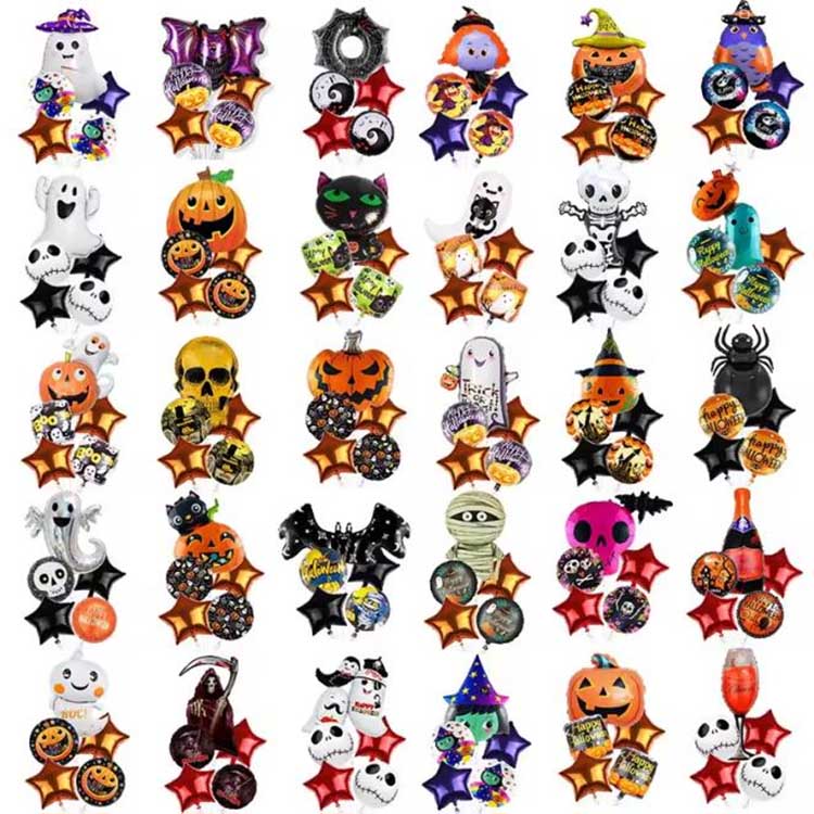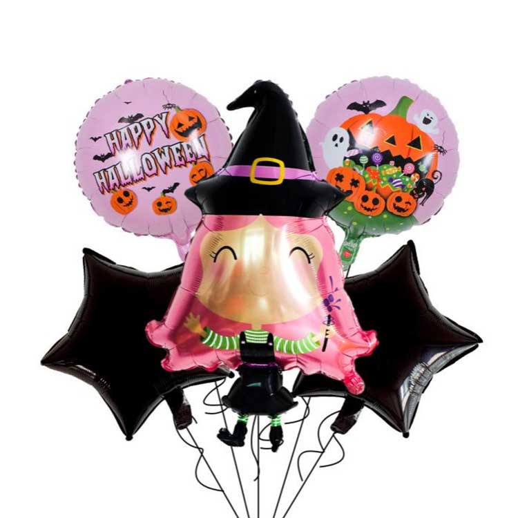 Halloween päť kusová súprava je balón špeciálne navrhnutý pre Halloween. Zvyčajne sa skladá z fóliových balónov, latexových balónov a ďalších doplnkov. Zahŕňa celkom päť typov balónov! Každá sada obsahuje vzor alebo postavu, ktorá dokonale zodpovedá téme Halloween. Ideálne na dekorácie Halloweenu, môžete dokonca naplniť balóny héliom, aby sa vznášali! To skutočne zosilňuje záhadnú atmosféru Halloweenu!