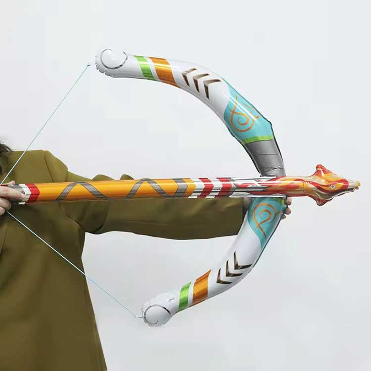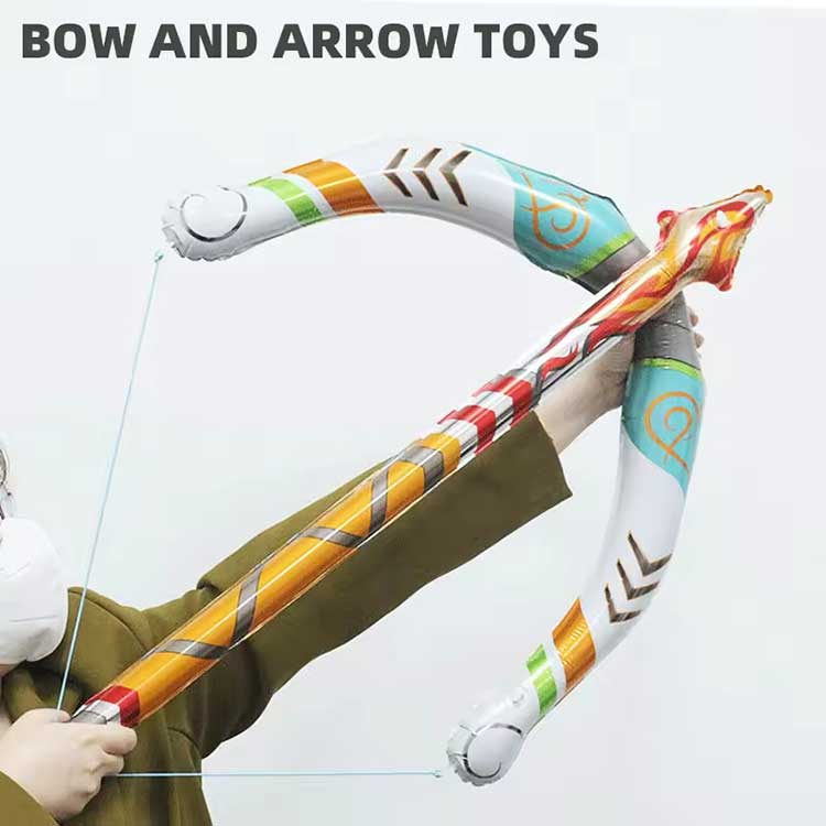 Nafukovací set hračiek s lukom a šípom je vyrobený z PVC, ktoré je schopné vydržať nadšené detské hry. Rýchlo sa nafúkne a dlho si zachováva svoj tvar. Obsahuje tri meče pre ľahšiu zameniteľnosť.