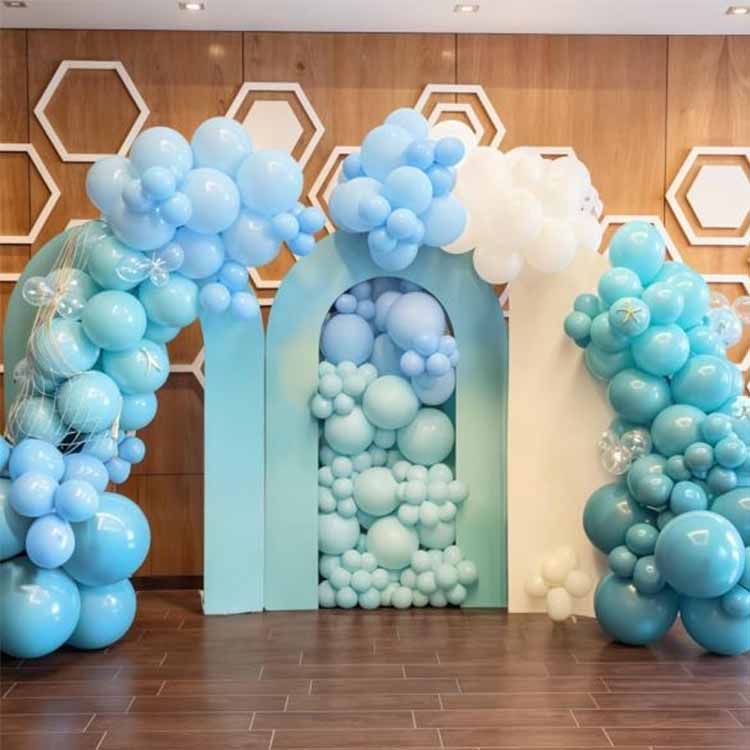 3. Balóny so špeciálnym efektom: Perleťové modré balóny (simulujúce odrazy oceánu) a flitrované balóny (so zabudovanými striebornými alebo modrými flitrami na simuláciu podmorského svetla hviezd)