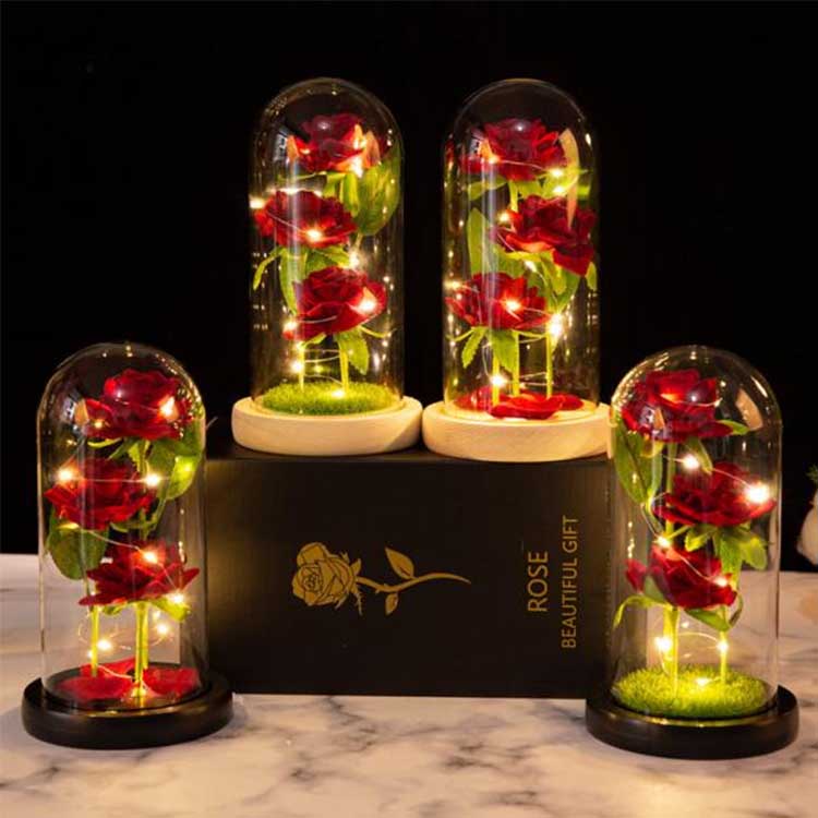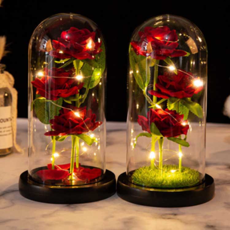 Vnútri kupoly z ružového skla sú tri zachovalé kvety umiestnené v rôznych výškach, s realistickými stonkami a zelenými listami. Sklenený kryt je odolný voči teplu a ľahko sa nepoškodí. LED strunové svetlá majú zabudované jemné osvetlenie a vypínač je umiestnený pod drevenou základňou pre ľahkú obsluhu. Vhodné na použitie vo svadobných dekoráciách a bytových zariadeniach, možno ho darovať aj ako darček k výročiu alebo darček k narodeninám. Sada obsahuje prispôsobiteľnú minimalistickú sklenenú kupolu